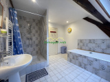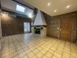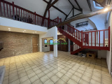 Composée d'une entrée avec placard, un salon avec toit cathédrale et sa cheminée XXL, une cuisine aménagée et équipée, une salle à manger, un wc , une salle d'eau et deux chambres.